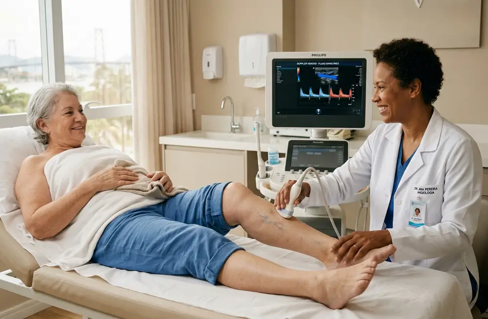 O angiologista — especialista em doenças das veias e artérias — é o profissional indicado para avaliar pernas que incham com frequência. A consulta inclui exame clínico detalhado e, na maioria dos casos, solicitação do eco doppler vascular.